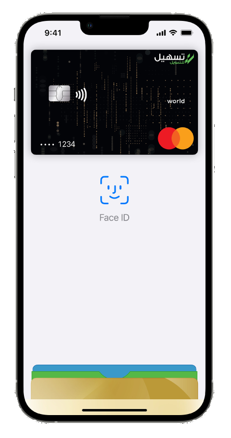 For iPhone 1.Open the wallet app 2.Tap the + sign on the top right 3.Use your camera to capture card details or enter manually 4.Set your Tasheel Credit card as your default card For Apple Watch 1. Open the Apple Watch app on your iPhone 2. Tap “Wallet & Apple Pay” 3. Tap “Add a Credit or Debit Card” 4. From there, follow the onscreen instructions