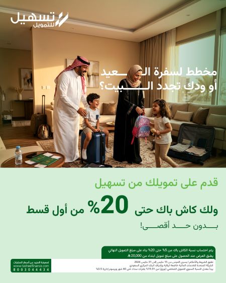 الحق عرض العيد وخذ تمويلنا الشخصي بالمبلغ اللي تبيه من 20،000 ريال وأكثر خلال فترة العرض ويجيك كاش باك يوصل 20% من أول قسط
