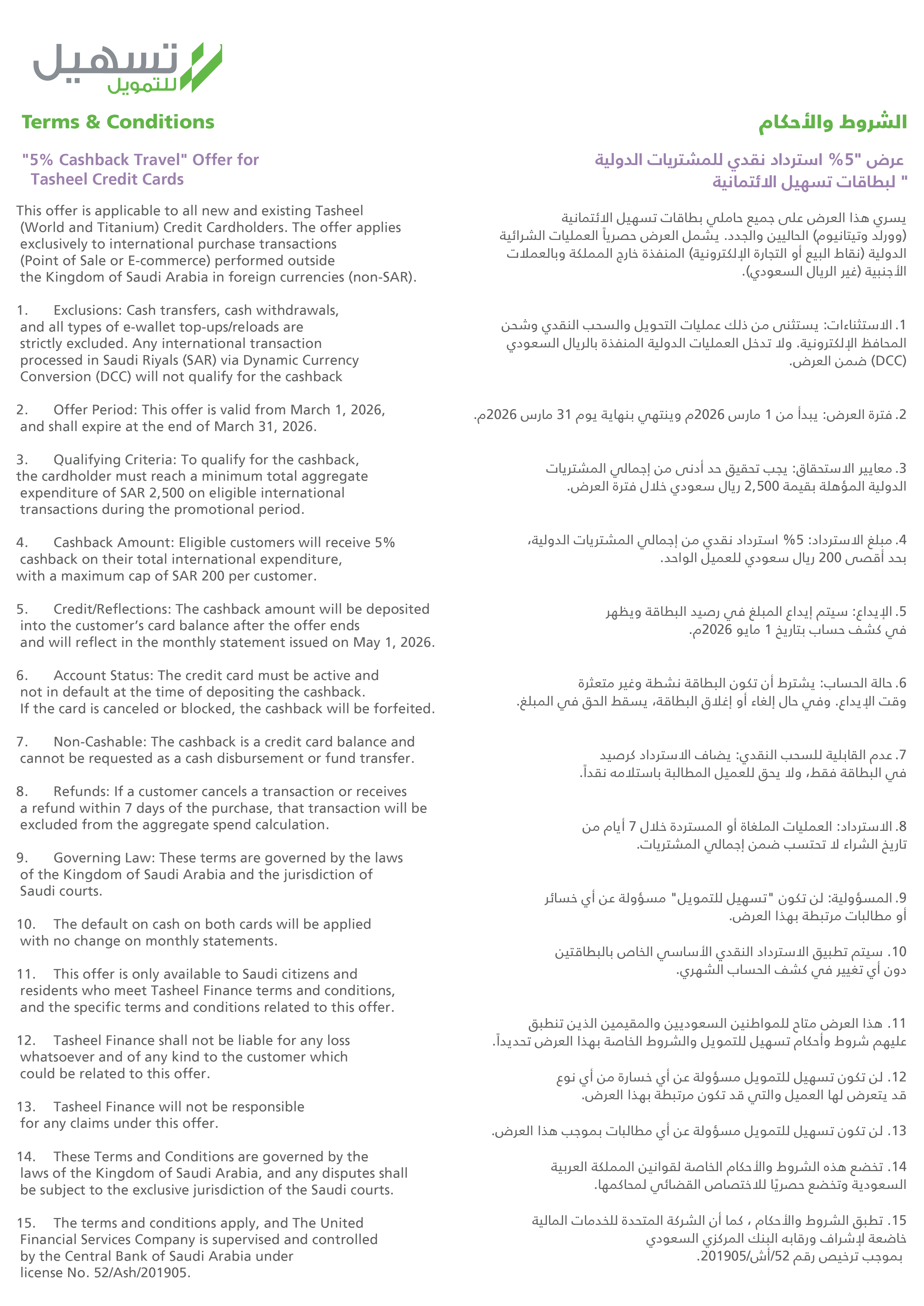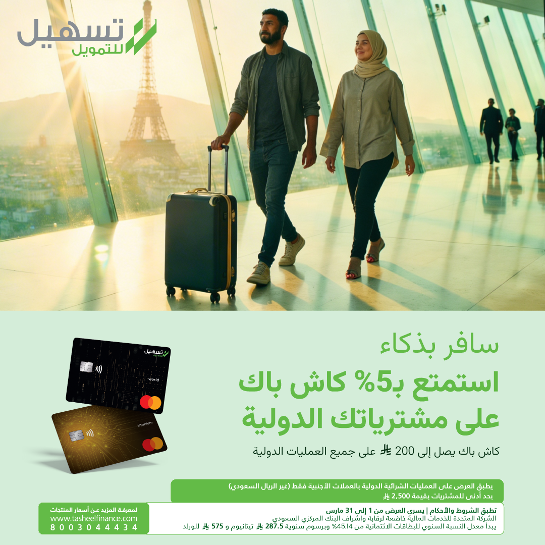 استخدم بطاقة تسهيل الائتمانية لجميع مشترياتك دوليا واحصل على كاش باك يوصل الى %5.