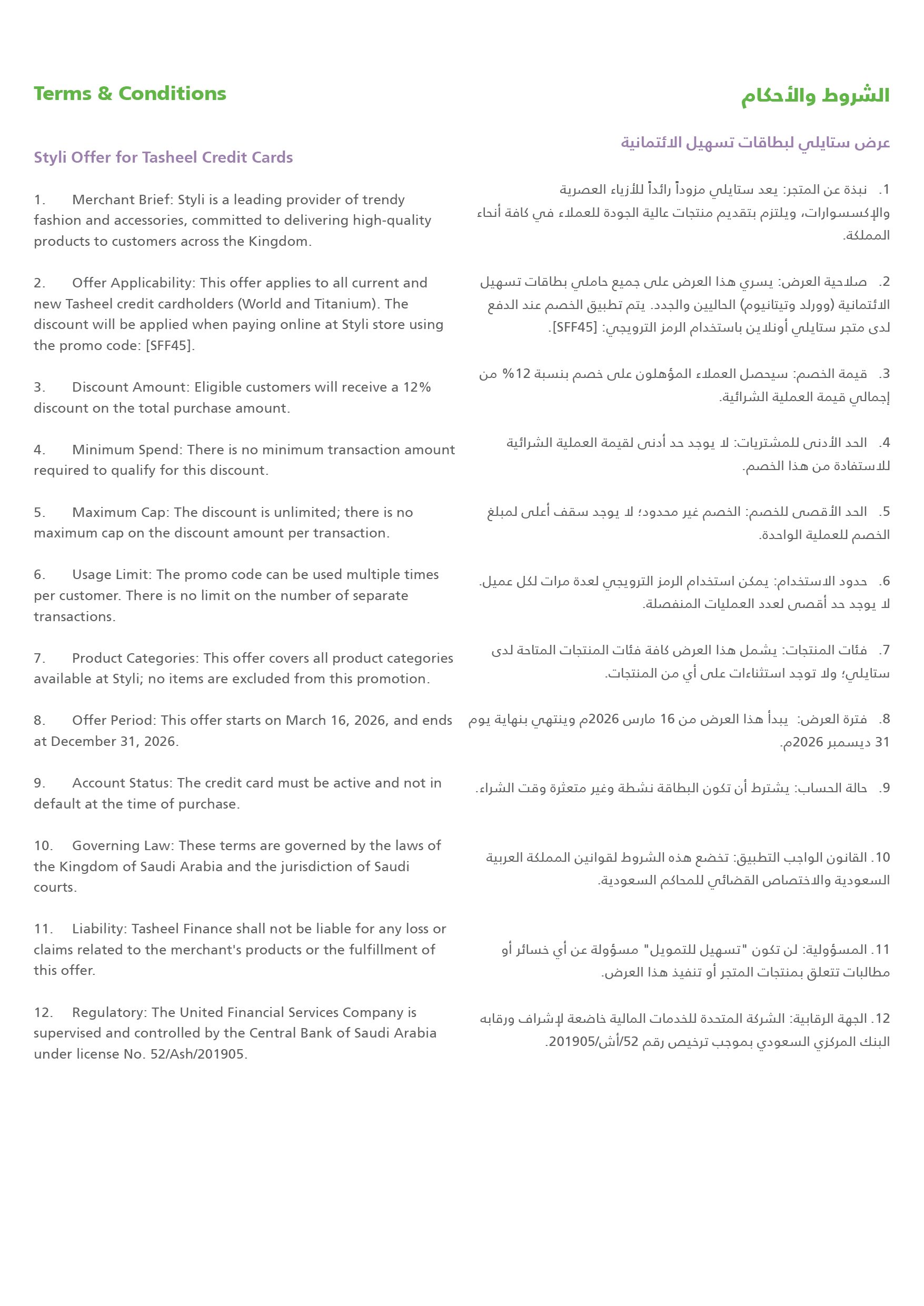 Get your Tasheel credit card and enjoy 12% off your purchases at Styli