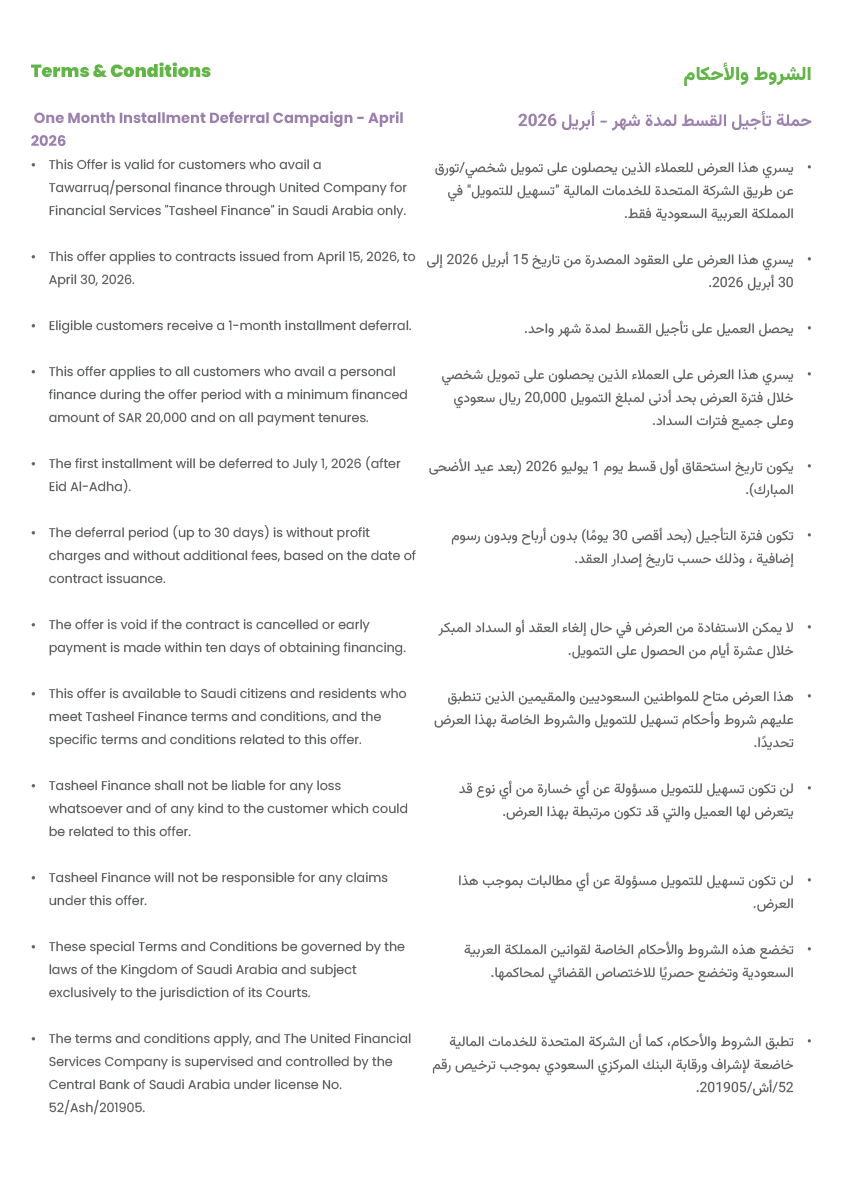 Get your personal finance with any amount starting from SAR 20,000 during offer period to enjoy first installment deferral for 1 month